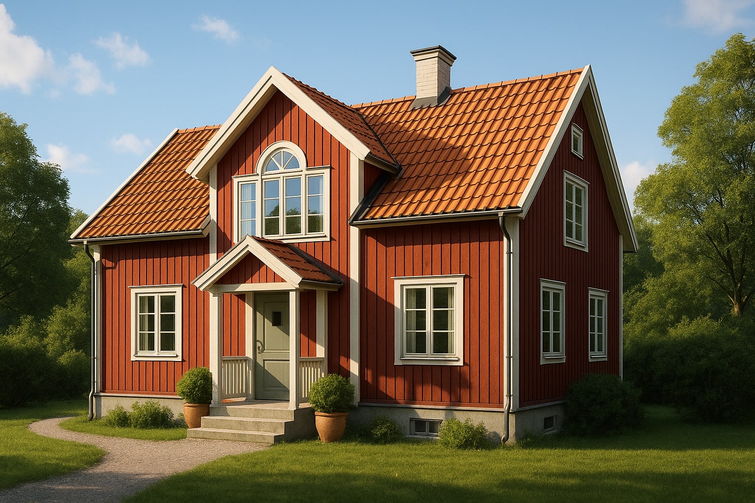 Flera fasadvyer, interiörer och kvällsljus för mäklar- och bygglovsmaterial.